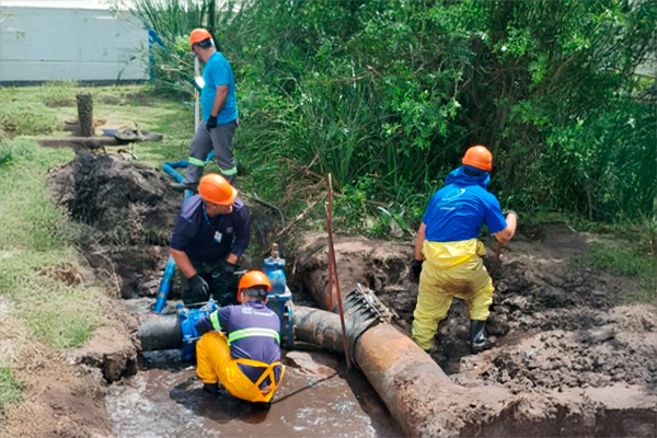 Equipe da Corsan trabalha para consertar adutora de água bruta, localizada próximo à captação na Lagoa da Emboaba, rompida na manhã desta quarta-feira, 19.