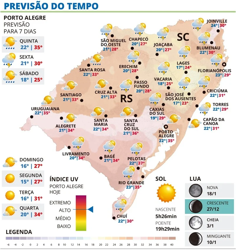 O sol aparece com nuvens neste primeiro dia de 2026. Ar quente cobre o estado e traz um dia de calor em todas as regiões, mais intenso no Oeste, Metade Sul, Grande Porto Alegre e Vales. O calor deve ser especialmente intenso nesta quinta numa faixa entre Jaguarão e Pelotas, no Sul do estado. O litoral deve ter dia de praia aproveitável.