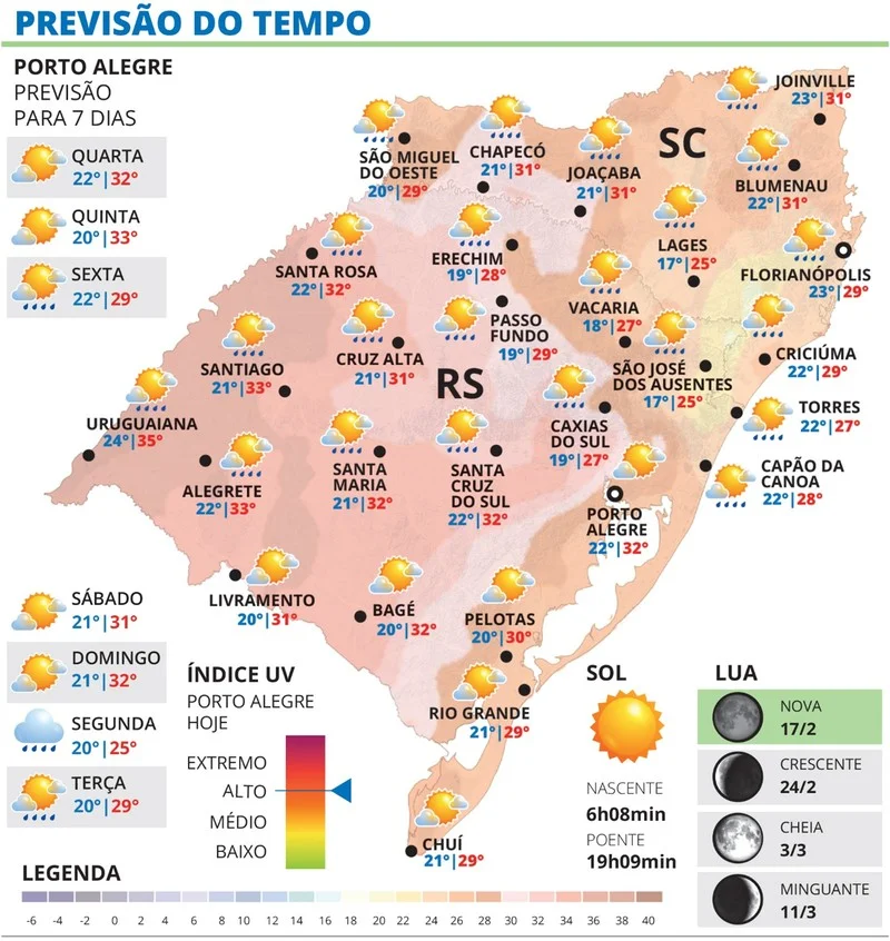 O calor prossegue e com sensação de abafamento. As maiores máximas ocorrem junto à Fronteira Oeste por efeito de uma bolha de calor no Norte da Argentina e no Paraguai. Em Uruguaiana, a temperatura pode chegar a 35ºC.