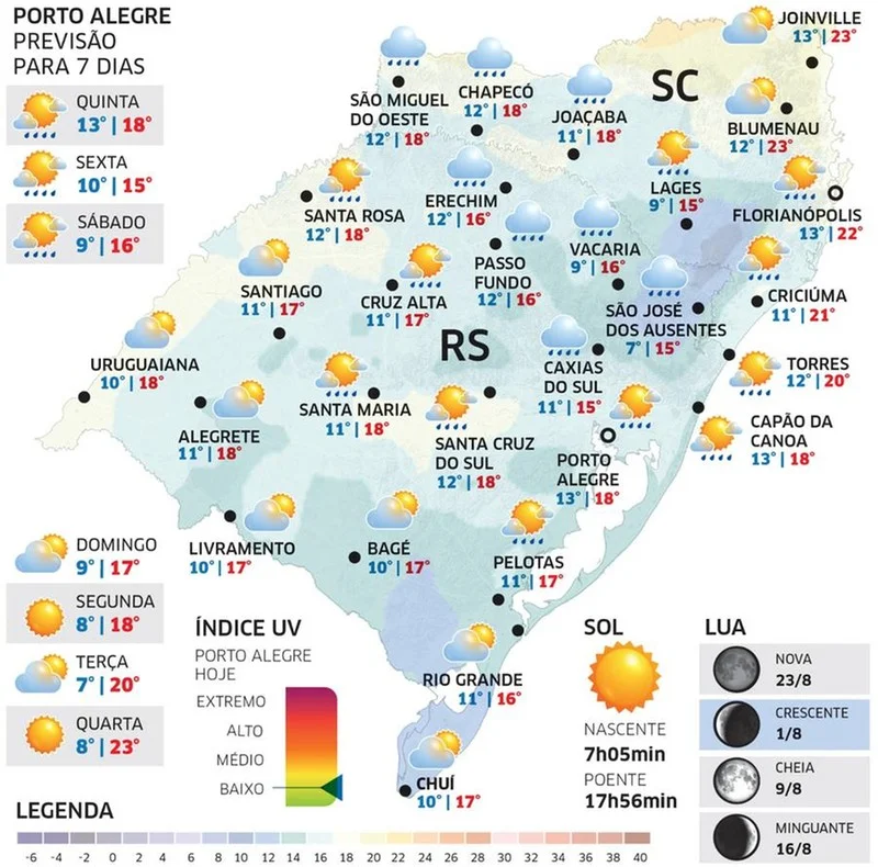 Na Metade Sul, a instabilidade será isolada. Mais a Oeste, na área de Uruguaiana, não deve chover. O sol pode aparecer com nuvens em alguns locais e, mesmo nas áreas sob chuva, podem ocorrer intervalos de melhoria. O dia será de temperatura amena, mas uma massa de ar frio começa a ingressar à noite pelo Oeste e o Sul.
