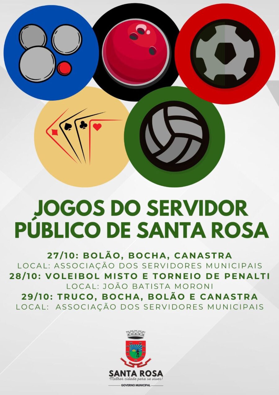 A Prefeitura de Santa Rosa, por meio da Secretaria de Esportes vai promover os Jogos do Servidor Público. As atividades vão ocorrer entre os dias 27 e 29 de outubro. A iniciativa tem como objetivo a integração, o lazer e o espírito esportivo entre os servidores municipais.