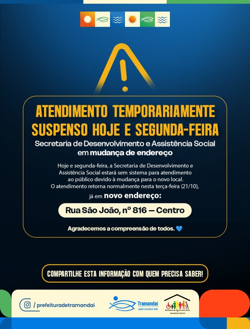 A Prefeitura de Tramandaí, por meio da Secretaria de Desenvolvimento e Assistência Social, informa que o atendimento ao público estará temporariamente suspenso nesta sexta-feira (17) e segunda-feira (20) devido à mudança de sede da Secretaria.